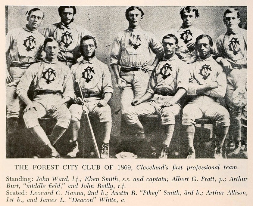 In 1869, L.C. Hanna became associated with Cleveland’s first professional baseball team, the Forest City Club, as its second baseman. The team included pros who were paid, such as Arthur Allison, outfielder and first baseman, Albert G. “Uncle Al” Pratt, pitcher, and James L. “Deacon” White, each of whom remained with the team until its demise in 1872, and amateurs such as L.C. Hanna, who remained “pure” and refused payment. On June 2, 1869, the Forest City Club played, and lost, 25-6, the first pro baseball game in Cleveland against the professional Cincinnati Red Stockings. The game was played in front of 2,000 spectators at Case Commons at Putnam Ave. (E. 38th St.) between Scovill Avenue and Central Avenue. On March 17, 1871, the Forest City Club became a charter member of the National Association of Professional Baseball Players.