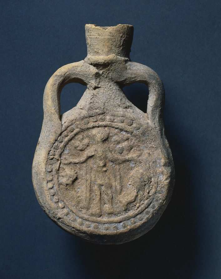 These flasks bear the image of Saint Menas, an early martyr of the Christian Church whose shrine was in the desert southwest of Alexandria in Egypt. These flasks were probably used by pilgrims to hold oil taken from the lamp that burned over this saint’s tomb. Probably manufactured near the shrine, pilgrim’s flasks often bear decorations hinting at their place of origin, as is the case here.
