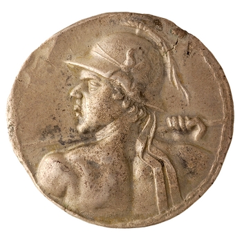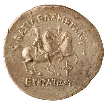 On the obverse we see the king in profile, wearing a plumed cavalry helmet. On the reverse, the twin heroes Castor and Pollux carry long lances and palm branches and ride prancing horses surrounded by a carelessly lettered inscription: ‘Great King Eucratides.’”