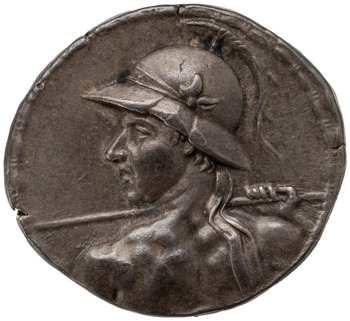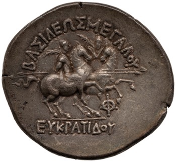 The Silver tetradrachm heading this post features on the obverse a helmeted and diademed bust of Eucratides, bare shoulders, throwing javelin to his left. The tetradrachm’s reverse has the Greek inscription ΒΑΣΙΛΕΩΣ ΜΕΓΑΛΟΥ ΕΥΚΡΑΤΙΔΟΥ (of great king Eucratides) around an image of the dioscuri (the twin brothers and sons of Zeus, Pollux and Castor) charging right holding long lances and palms. Peter Thonemann, commenting on this highly individualist and explicitly martial portraiture opined as follows: “… we may be grateful that not all kings paraded their military credentials in quite so butch a fashion as Eucratides I of Bactria.”